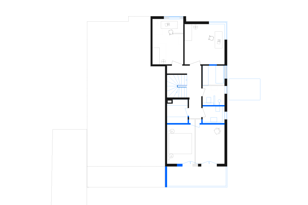 Anbau gartenseitig, Umbau des Dachstuhls, Überarbeitung Fassade, Neustrukturierung Grundriss inkl. Verlegung der Bäder.