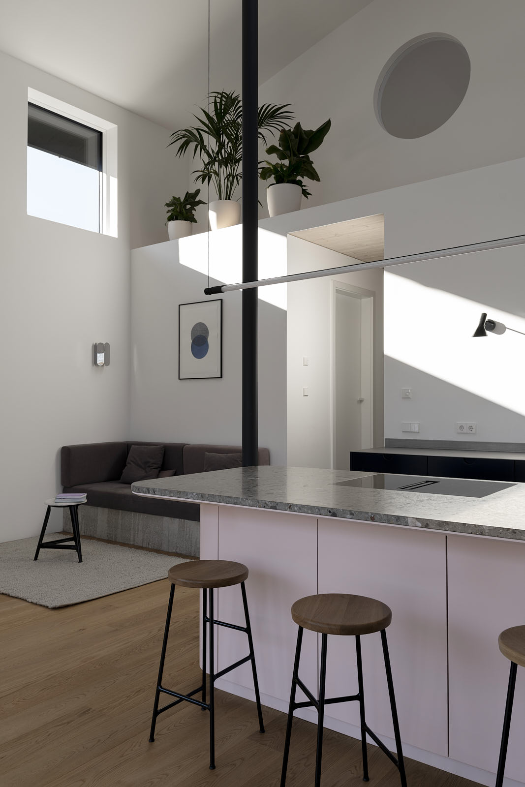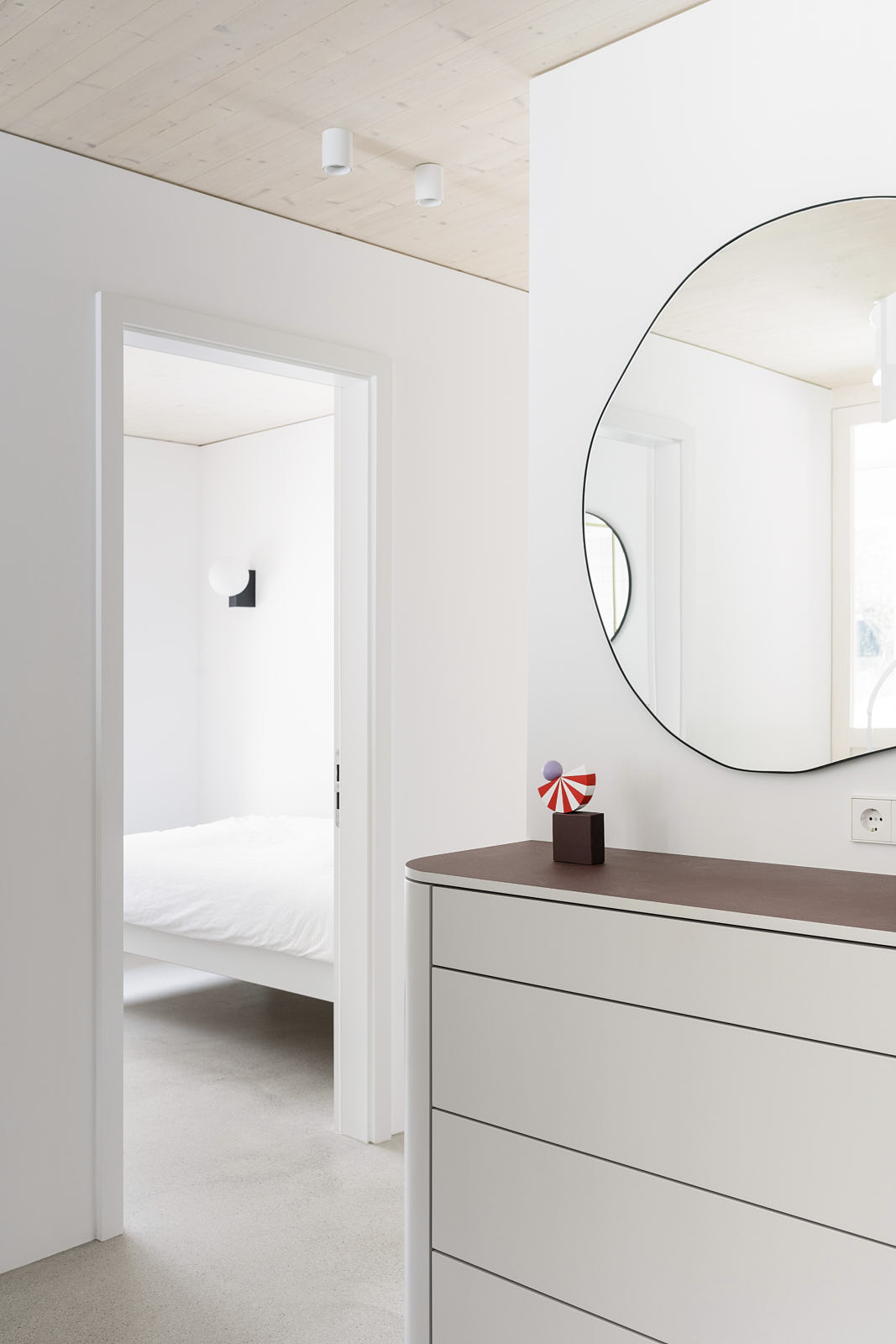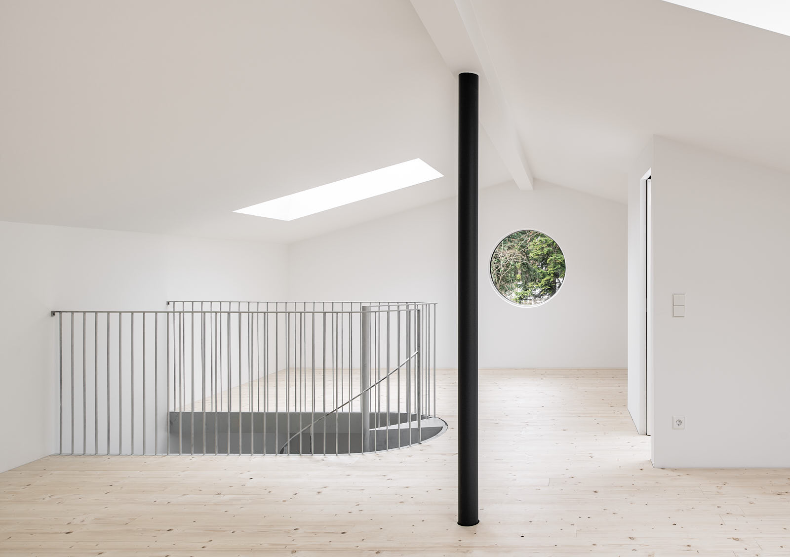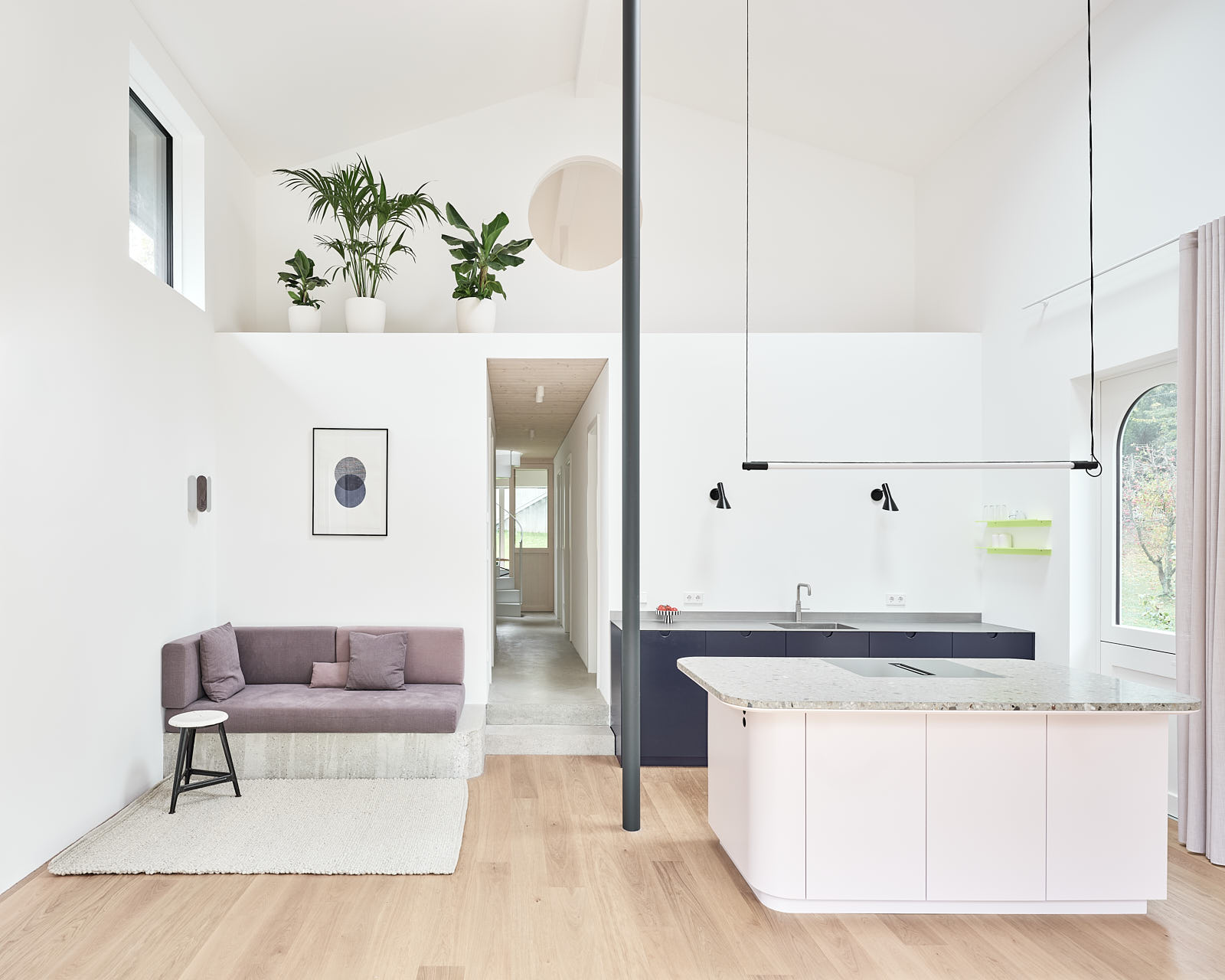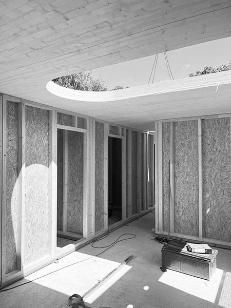 Der Wohnbereich ist zweigeschossig und erhält viel Tageslicht aus 4 Richtungen, mit Ausblicken auf Grundstück und See.