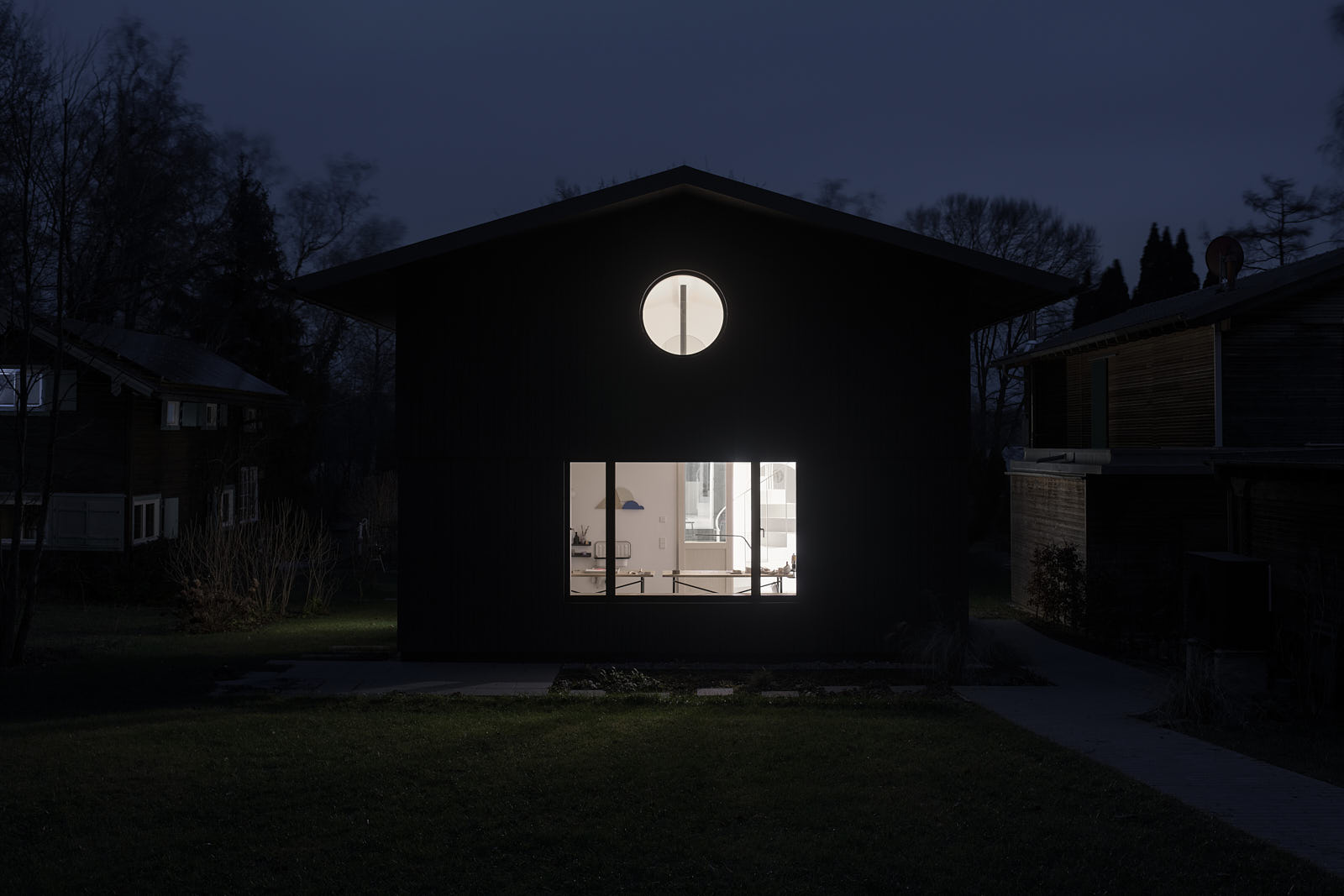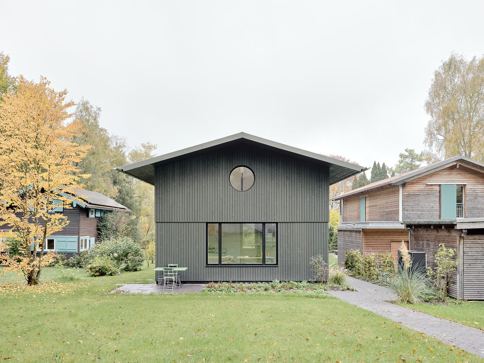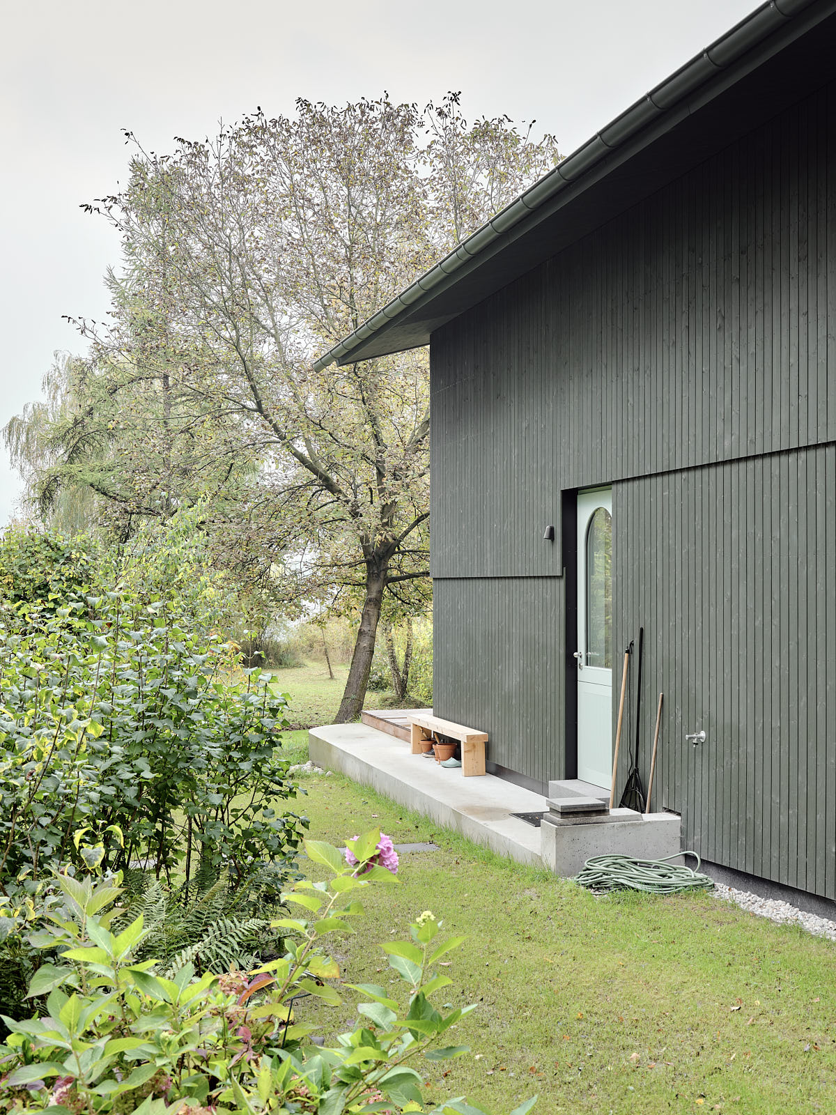 Das Gestaltung des Hauses ist angelehnt an traditionelle Bootshäuser, bei denen ein großes Satteldach die Fassade schützt. Der Holzbau ist nicht unterkellert.