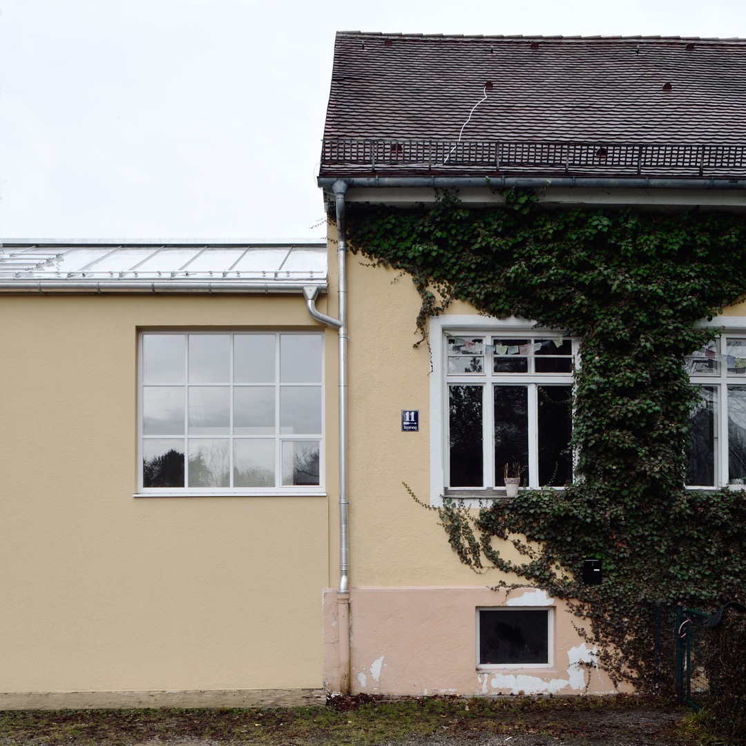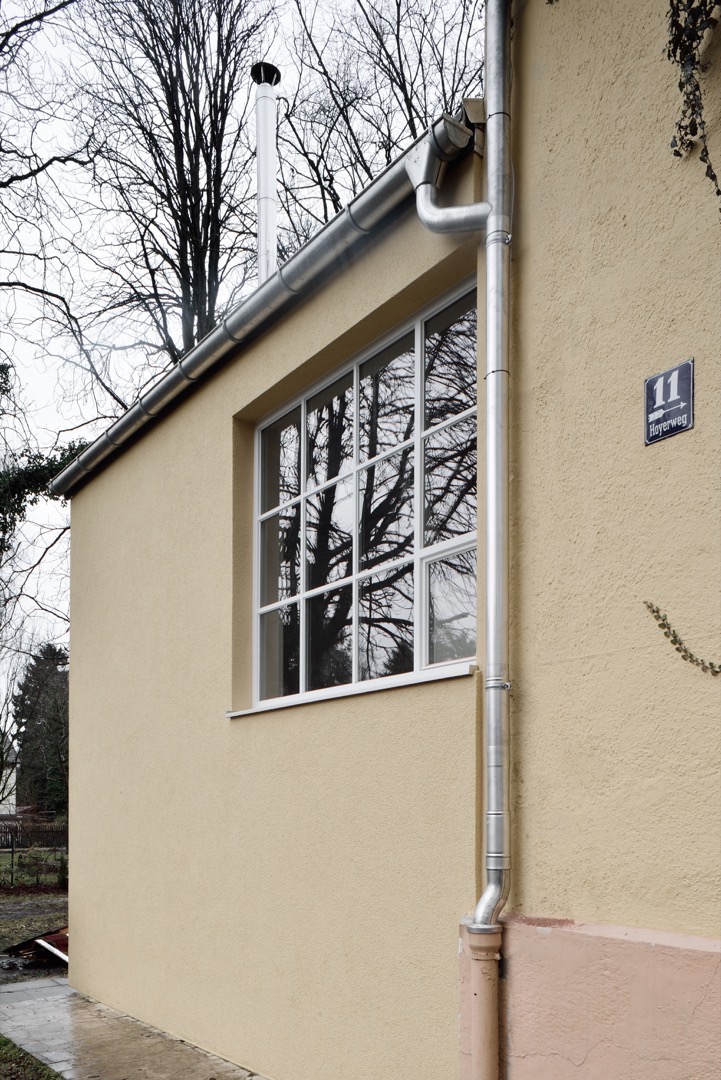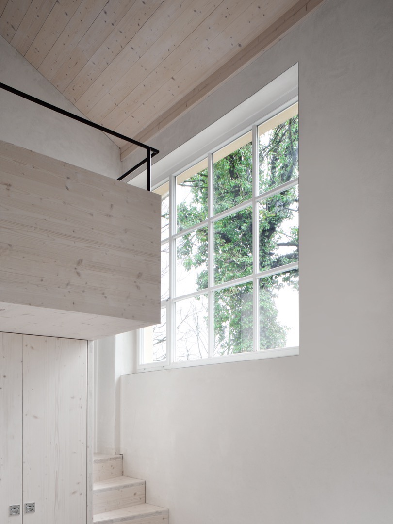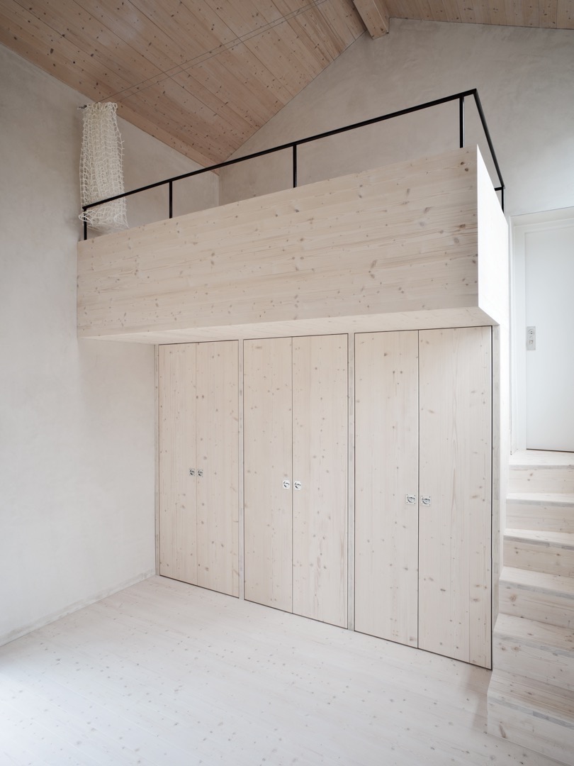 Der seitliche Anbau einer ehemaligen Gaststätte wurde in ein Schlafzimmer mit Empore umgebaut. Über die Empore wurde auch ein direkter Zugang zum Haupthaus geschaffen, und ein Heizkamin eingebaut.