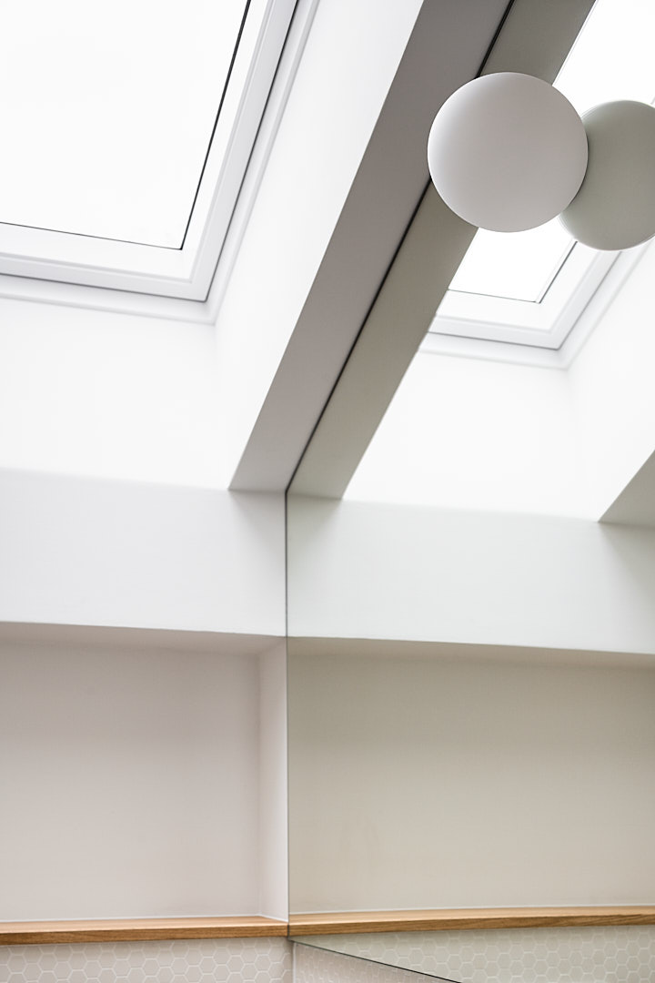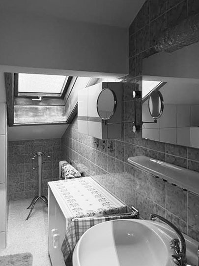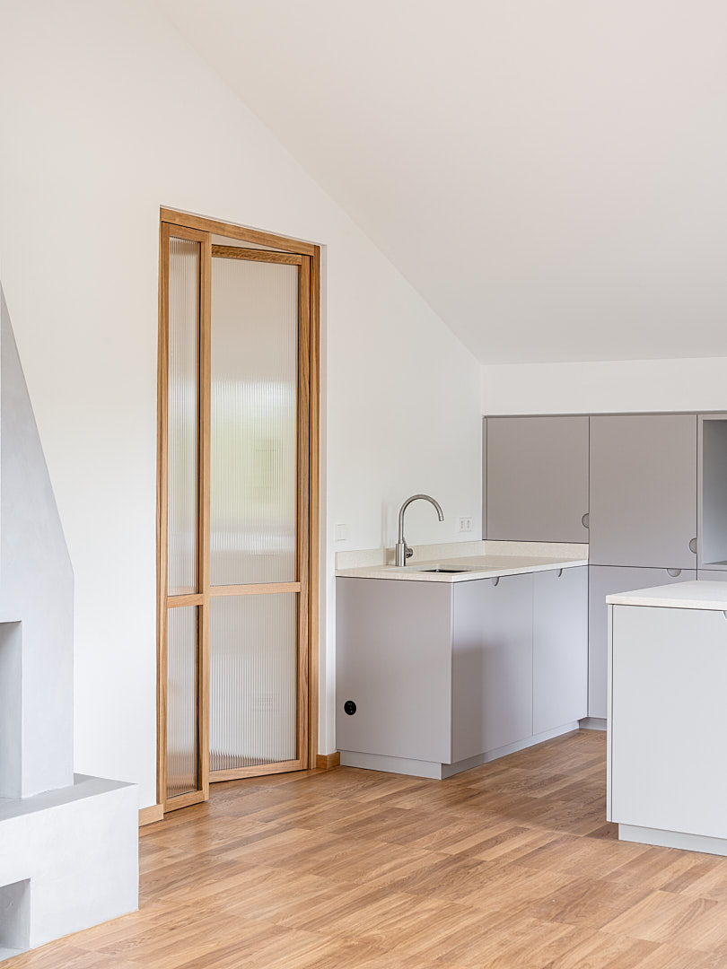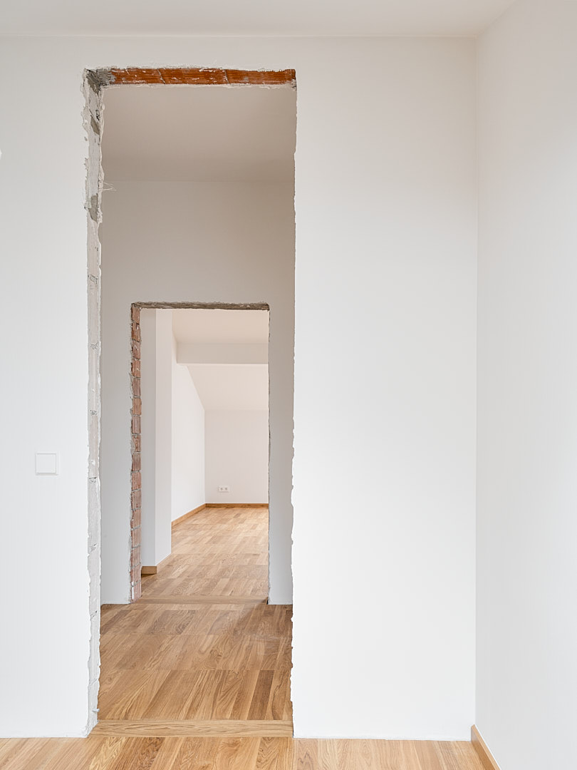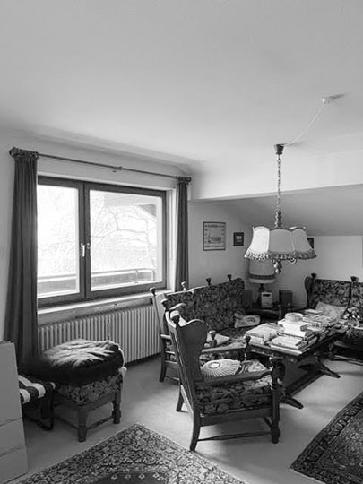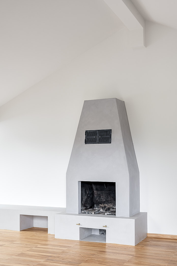 Die Dachgeschosswohnung von 1978 wurde umfassend saniert, mit Erweiterung in den Dachraum, Dachflächenfenstern, Anpassung der Haustechnik; der bestehende Kaminofen überarbeitet, alle Oberflächen und die Bäder erneuert.