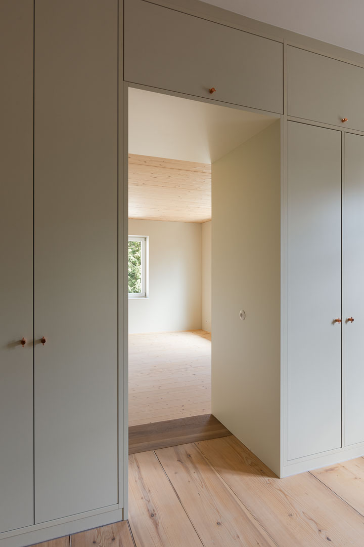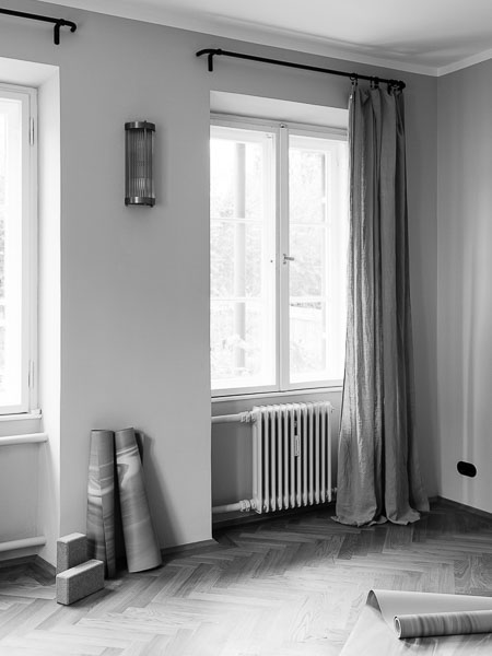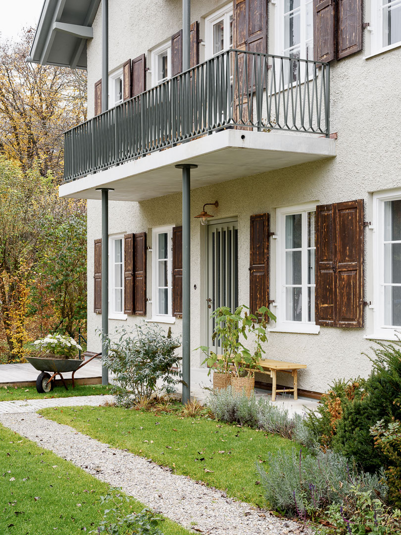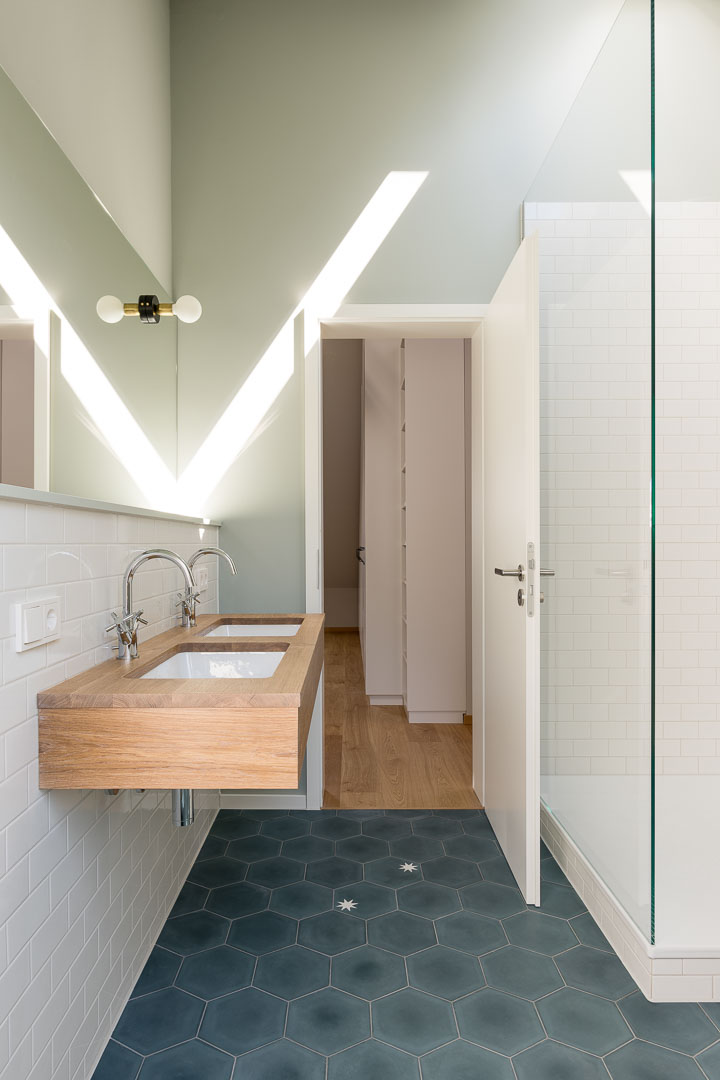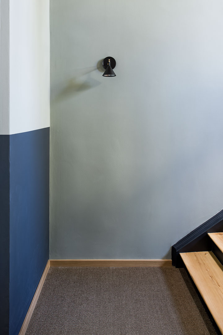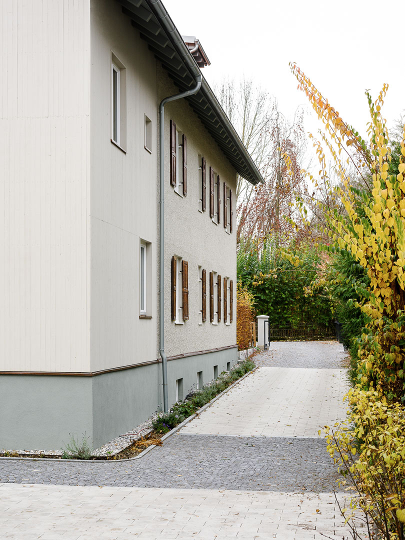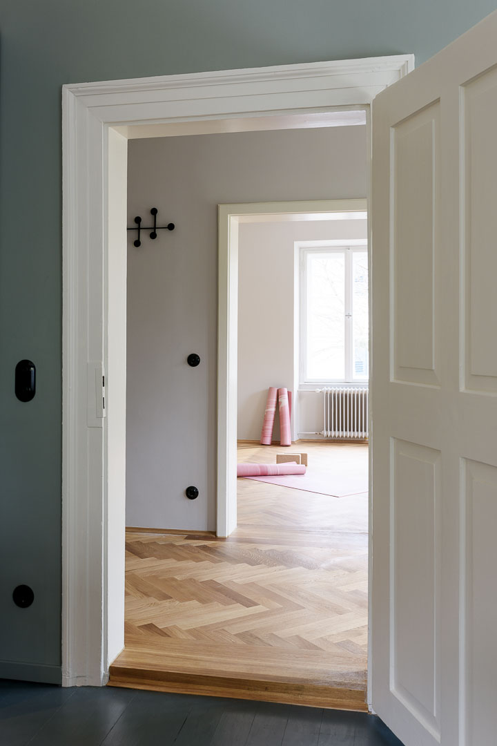 Erweiterung und Instandsetzung eines Mehrfamilienhauses mit Umbau in ein Yogastudio und drei Wohnungen (Gebäudeklasse IV). Dafür wurde das Haus um einen profilgleichen Anbau erweitert, der das bestehende Treppenhaus einschließt. Der Anbau wurde in massiver Holzbauweise ausgeführt und ist im östlichen Teil im Schnitt leicht versetzt zum Bestandsgebäude. Das Dach wurde in Stand gesetzt, um den Anbau erweitert und gedämmt. Die Haustechnik, die z.T. noch aus den 20er Jahren stammte, wurde erneuert. Die Decken wurden brandschutztechnisch überholt, alle Oberflächen überarbeitet und die Bäder erneuert. Der Bestand wurde dabei soweit wie möglich herausgearbeitet bzw. erhalten.