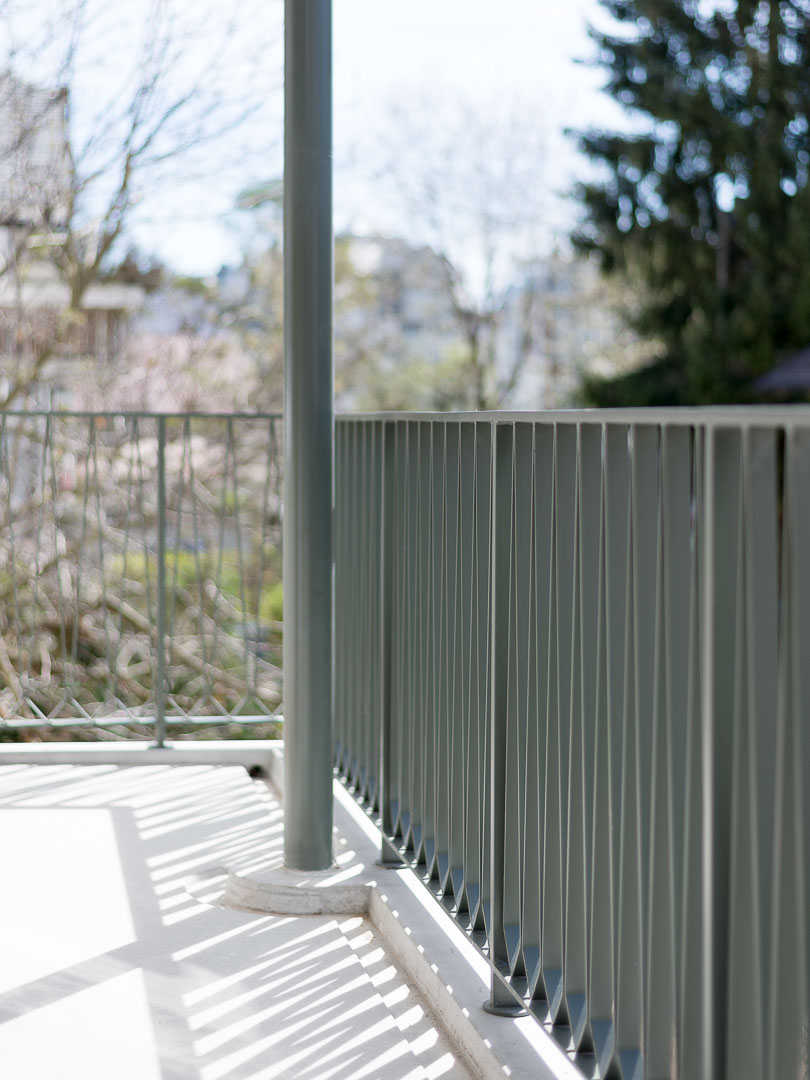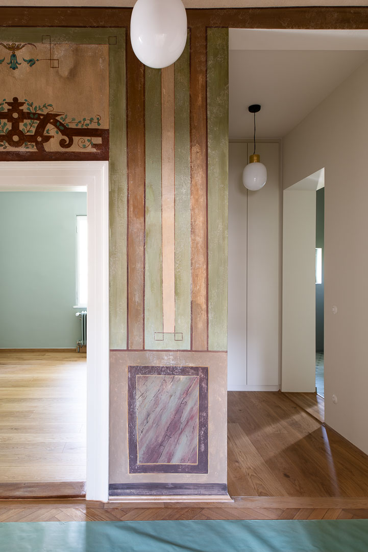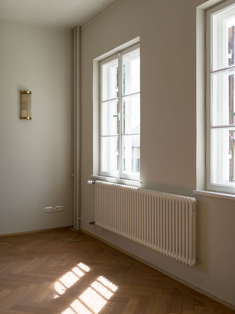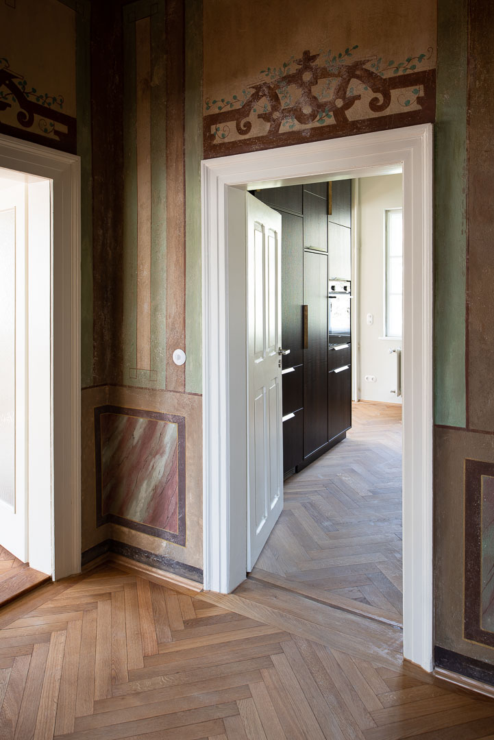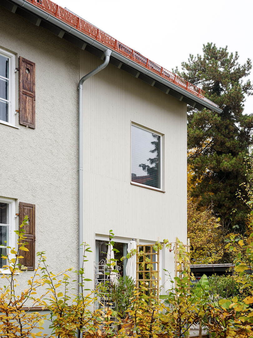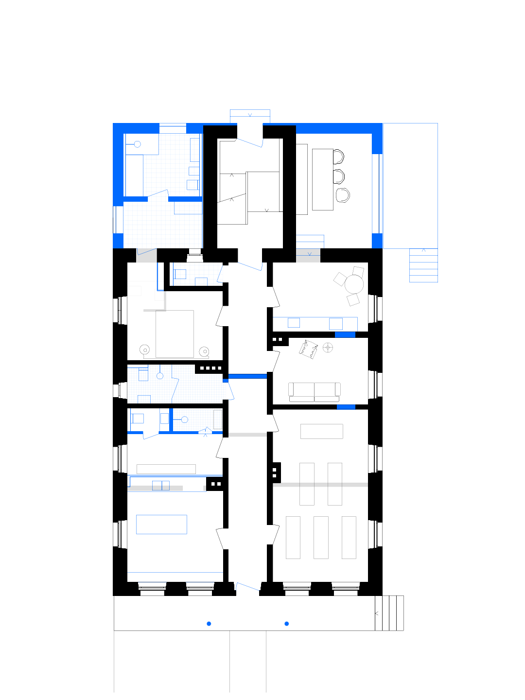 Erweiterung und Instandsetzung eines Mehrfamilienhauses mit Umbau in ein Yogastudio und drei Wohnungen (Gebäudeklasse IV). Dafür wurde das Haus um einen profilgleichen Anbau erweitert, der das bestehende Treppenhaus einschließt. Der Anbau wurde in massiver Holzbauweise ausgeführt und ist im östlichen Teil im Schnitt leicht versetzt zum Bestandsgebäude. Das Dach wurde in Stand gesetzt, um den Anbau erweitert und gedämmt. Die Haustechnik, die z.T. noch aus den 20er Jahren stammte, wurde erneuert. Die Decken wurden brandschutztechnisch überholt, alle Oberflächen überarbeitet und die Bäder erneuert. Der Bestand wurde dabei soweit wie möglich herausgearbeitet bzw. erhalten.