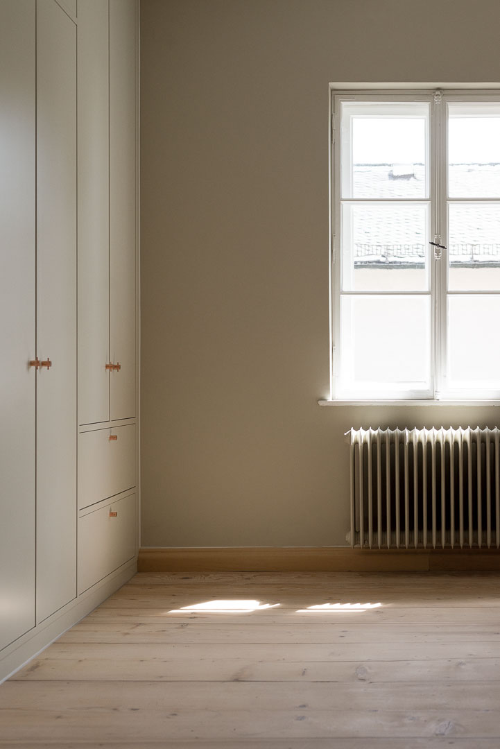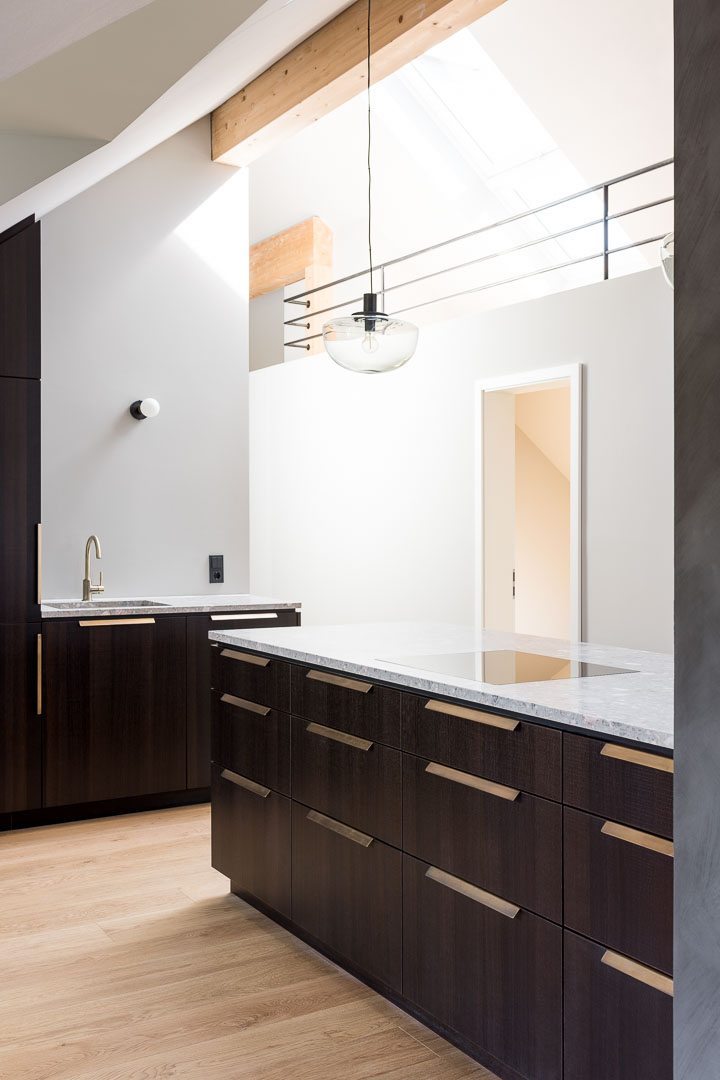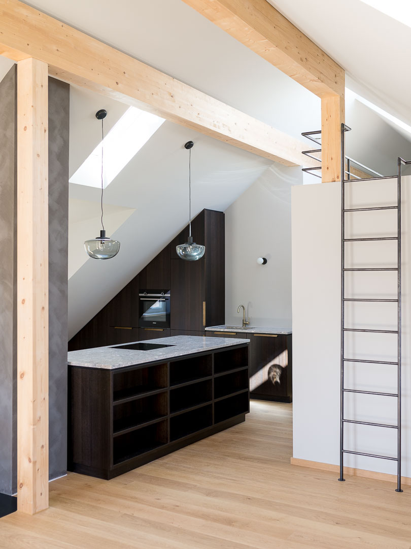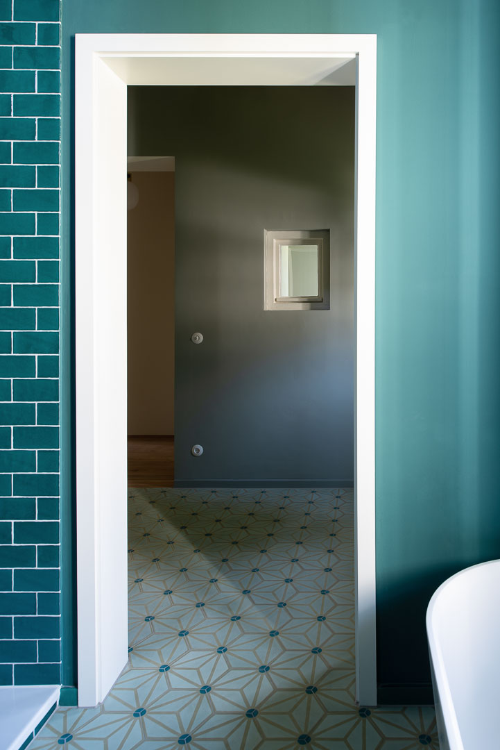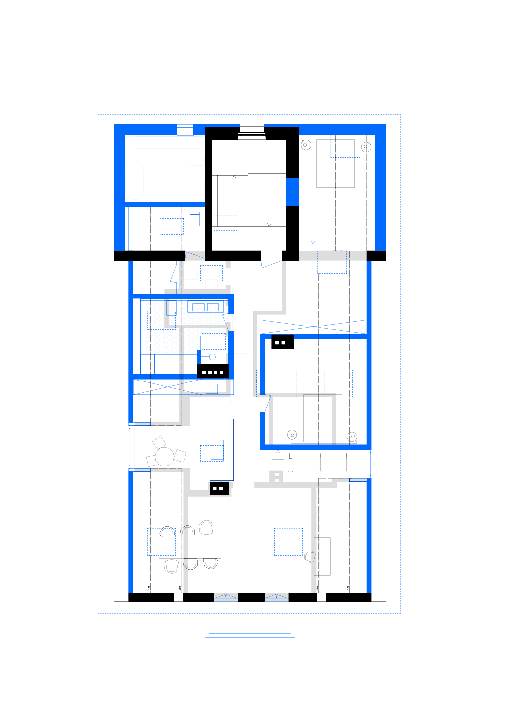 Erweiterung und Instandsetzung eines Mehrfamilienhauses mit Umbau in ein Yogastudio und drei Wohnungen (Gebäudeklasse IV). Dafür wurde das Haus um einen profilgleichen Anbau erweitert, der das bestehende Treppenhaus einschließt. Der Anbau wurde in massiver Holzbauweise ausgeführt und ist im östlichen Teil im Schnitt leicht versetzt zum Bestandsgebäude. Das Dach wurde in Stand gesetzt, um den Anbau erweitert und gedämmt. Die Haustechnik, die z.T. noch aus den 20er Jahren stammte, wurde erneuert. Die Decken wurden brandschutztechnisch überholt, alle Oberflächen überarbeitet und die Bäder erneuert. Der Bestand wurde dabei soweit wie möglich herausgearbeitet bzw. erhalten.