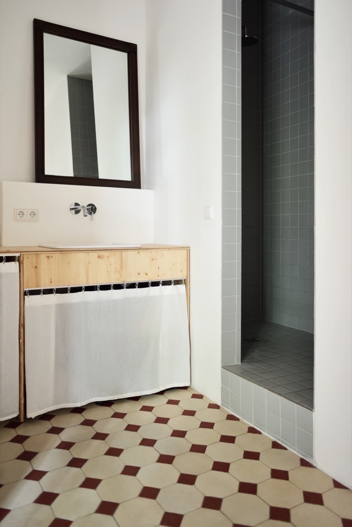 Um die verhältnismäßig geringe Fensterfläche gut auszunutzen, wurde das Bad in den gefangenen Raum verlegt und eine Dusch-/ WC- Scheibe eingebaut.