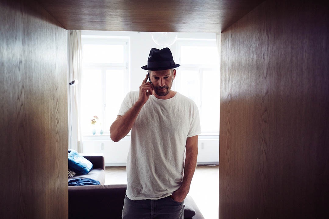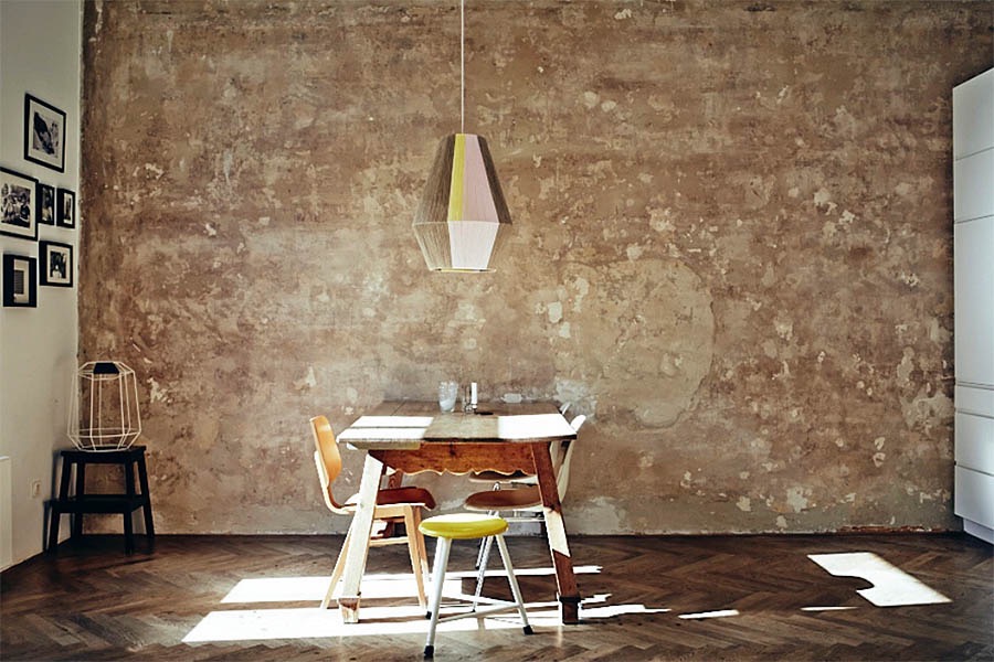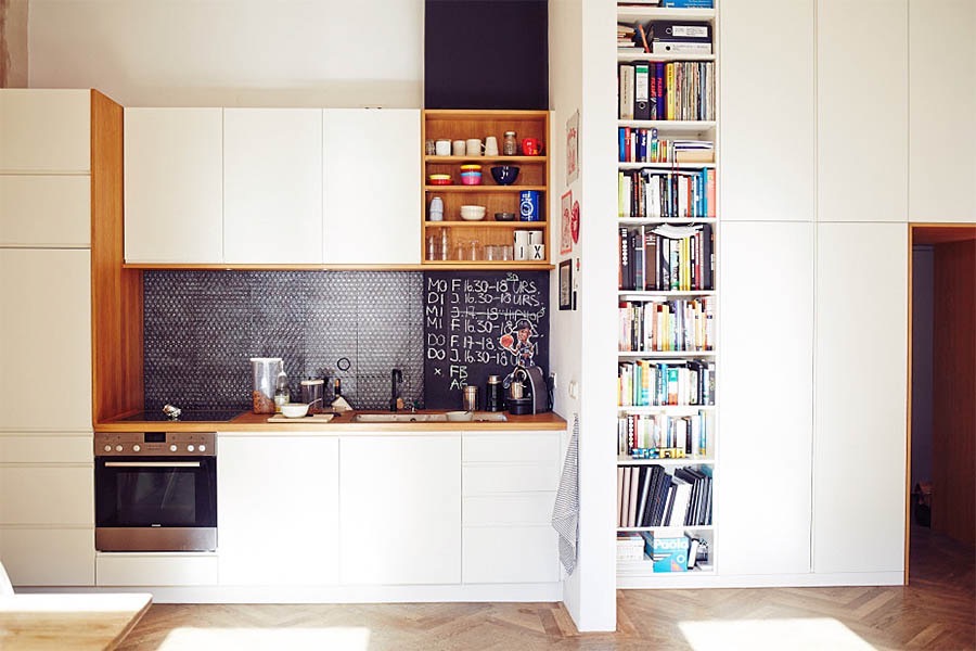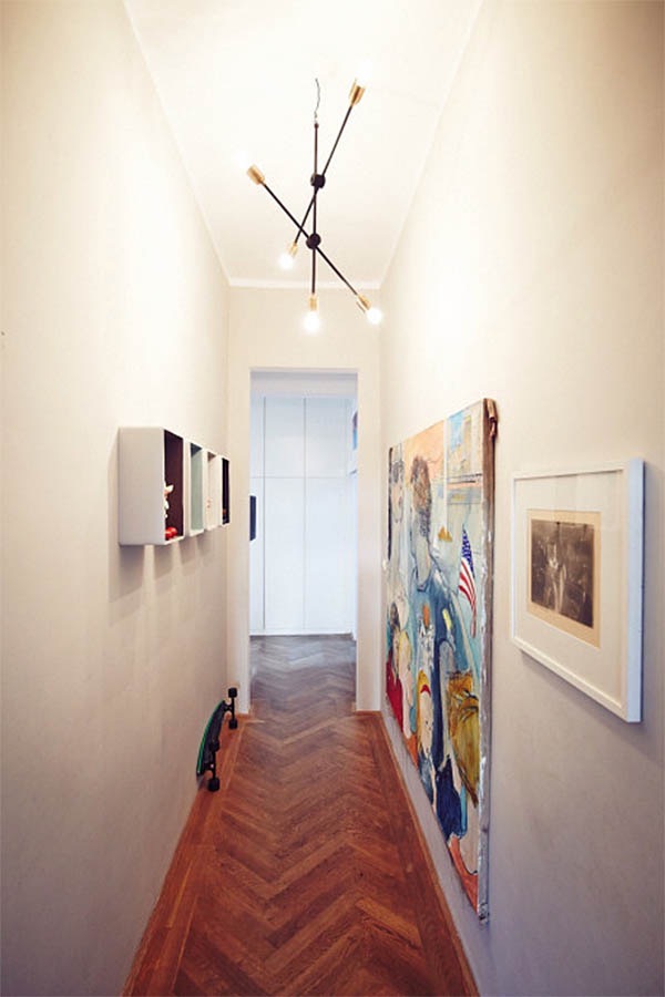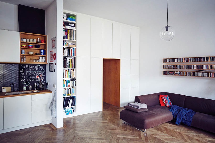 Verstärkt wird die Gliederung durch einen „Tunnels“, der durch eine Aufdopplung der Innenwand von beiden Seiten entsteht - Ankleide und Garderobe von einer Seite, Bücherregal, Schrank und integrierter Arbeitsplatz von der Wohnzimmerseite.