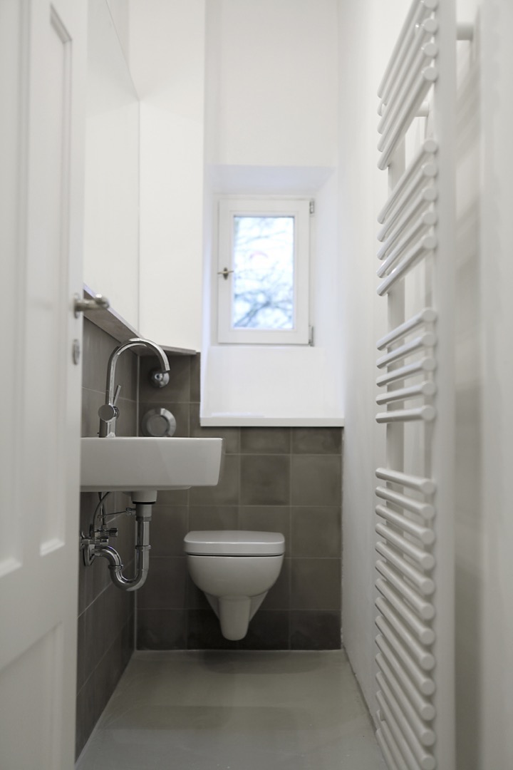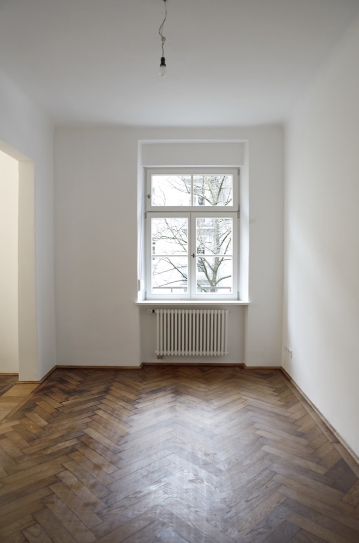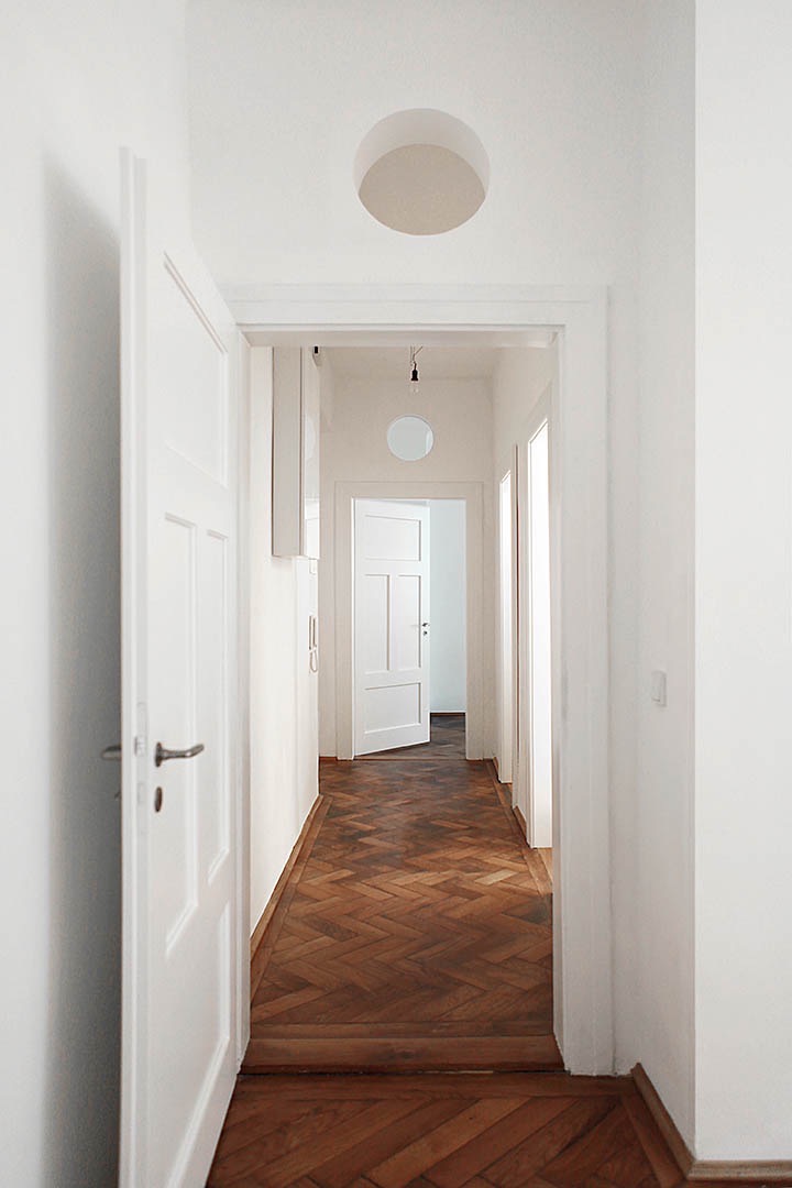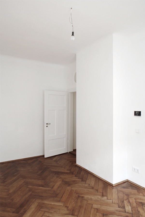 Durch die Reduktion bzw. Rückführung auf die Materialien Eichenparkett, weißer Kalkputz und kiesel-farbene Zementplatten wirken die Räume großzügig und die Raumproportionen kommen wieder zur Geltung.
