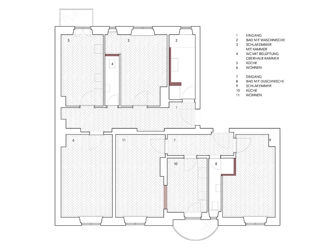 Im Grundriss wurde die ursprüngliche Wohnungsteilung der nebeneinander liegenden Einheiten sowie die ursprüngliche Raumstruktur wiederhergestellt. In der kleineren Wohneinheit wurde die Küche durch einen Durchbruch zum Wohnzimmer geöffnet und dem Bad eine “Duschbox“ zugefügt, vom Schlafzimmer abgeteilt, um ein funktionierendes Duschbad zu erhalten.