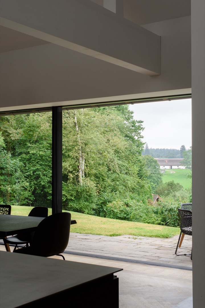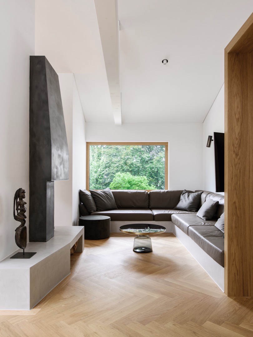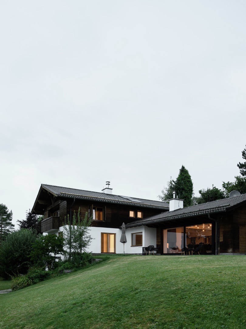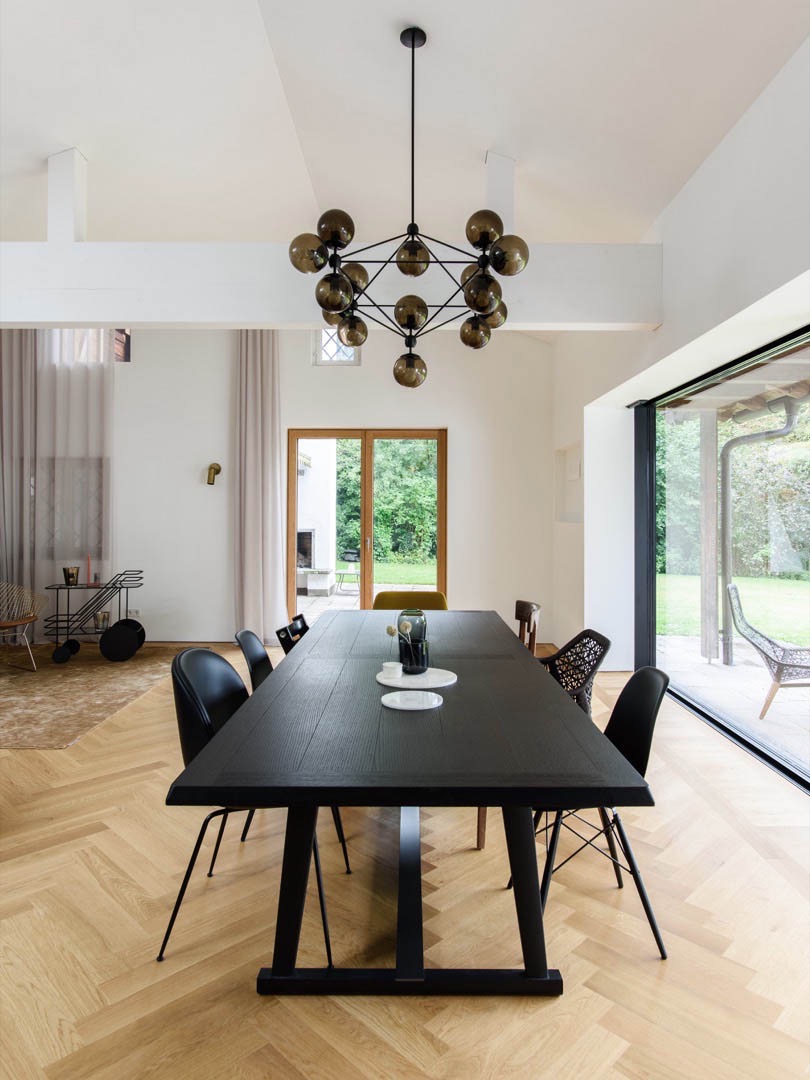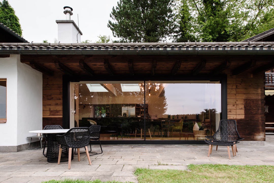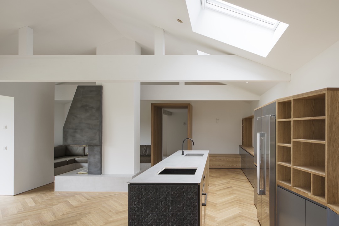 Der älteste Teil des Einfamilienhauses wurde von einem kleinteiligen Bereich aus 5 niedrigen Zimmern in eine große Wohnküche mit geöffnetem Dachraum, Schiebe-Element zur Terrasse und Heizkamin verwandelt.
