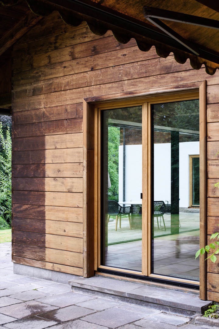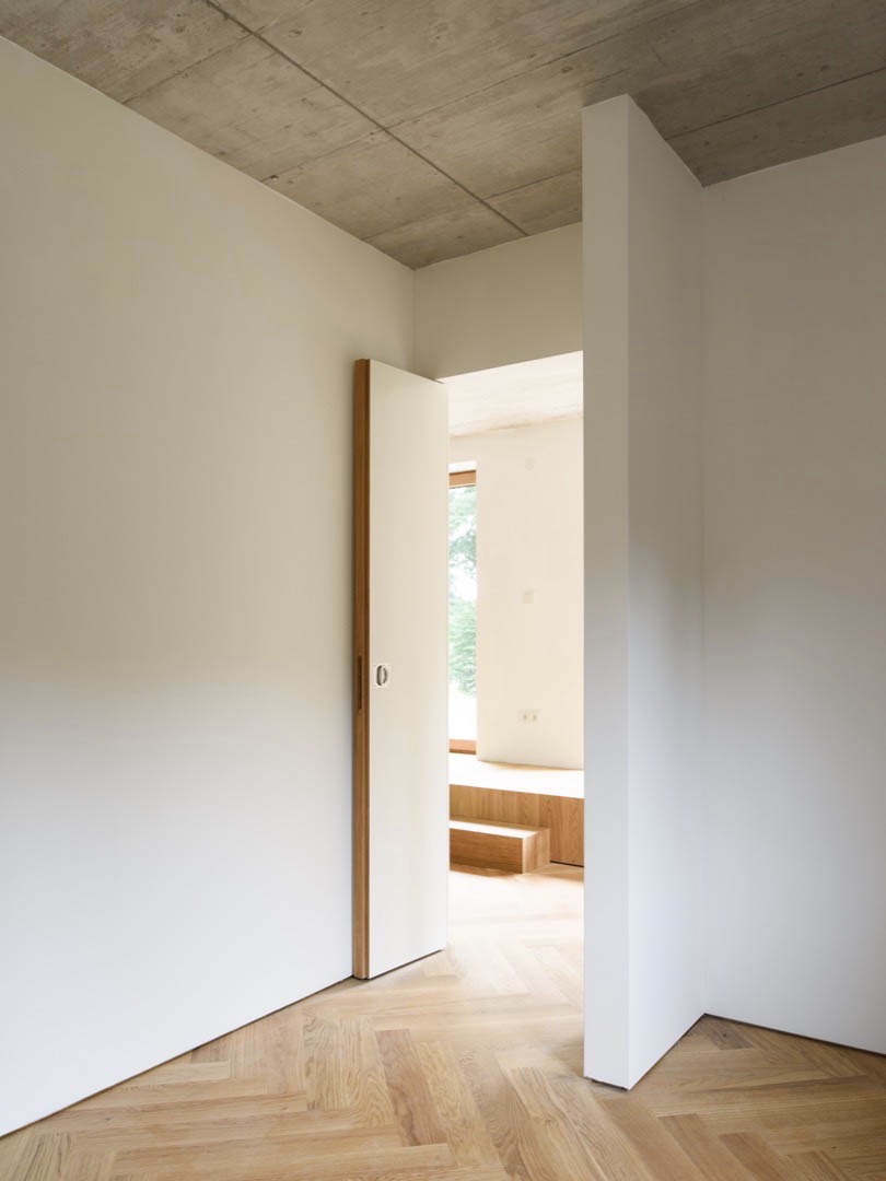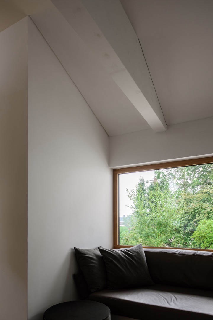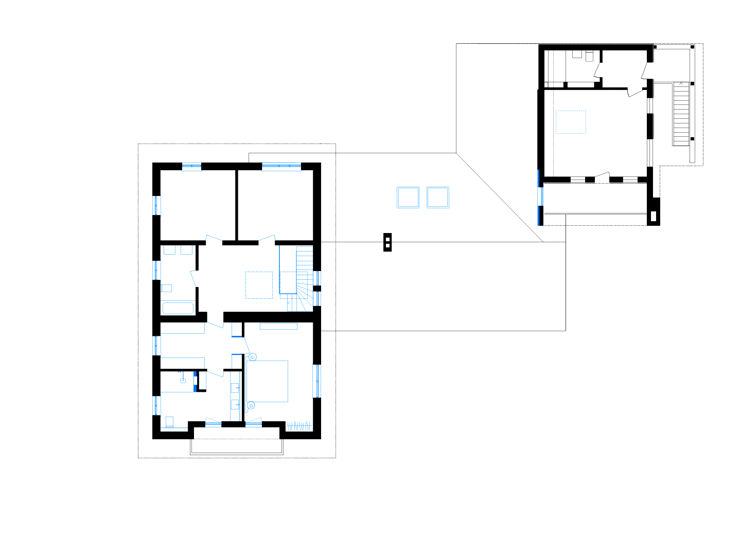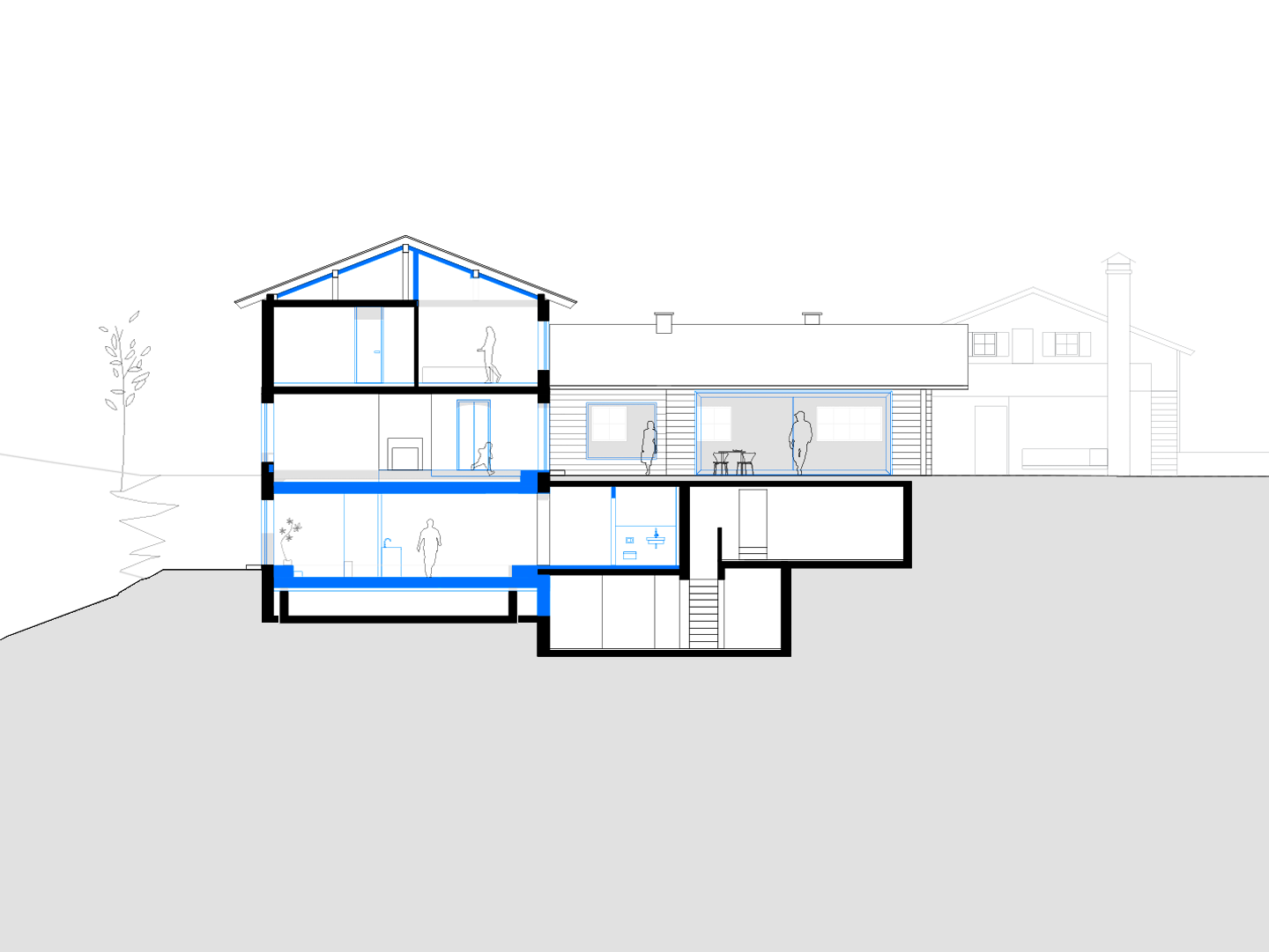 Der neuere Gebäudeteil ist dreigeschossig und stammt aus den 80er Jahren. Hier wurde das Schwimmbad stillgelegt und in eine Gästewohnung umgebaut, daraufhin die Raumproportionen im ganzen Haus überarbeitet – im Wohnzimmer wurde die Geschossdecke abgesenkt, im Obergeschoss teilweise der Dachraum geöffnet.