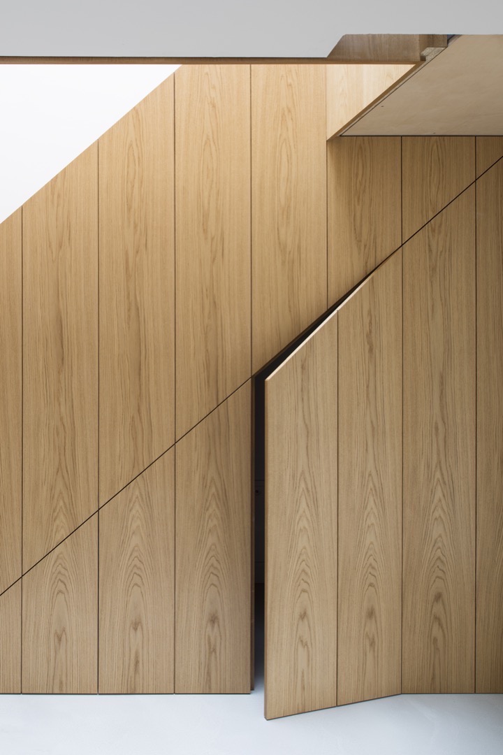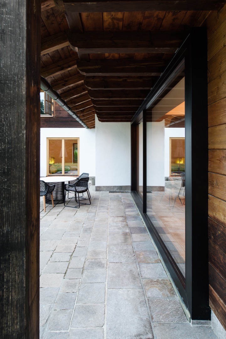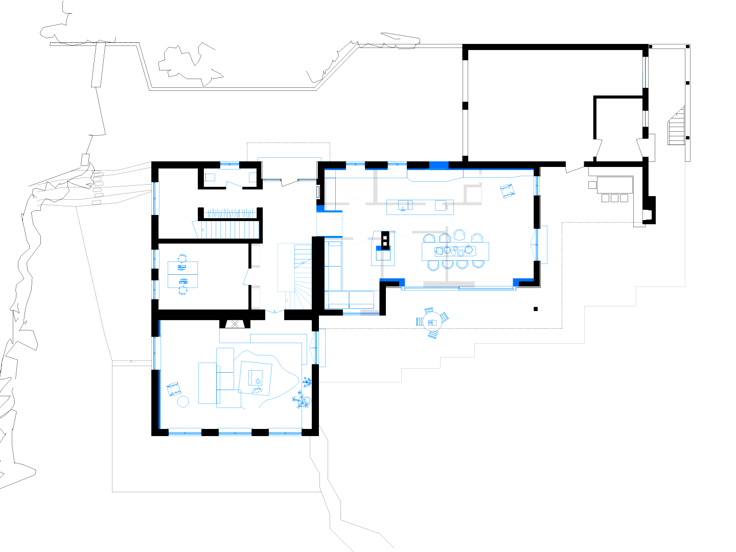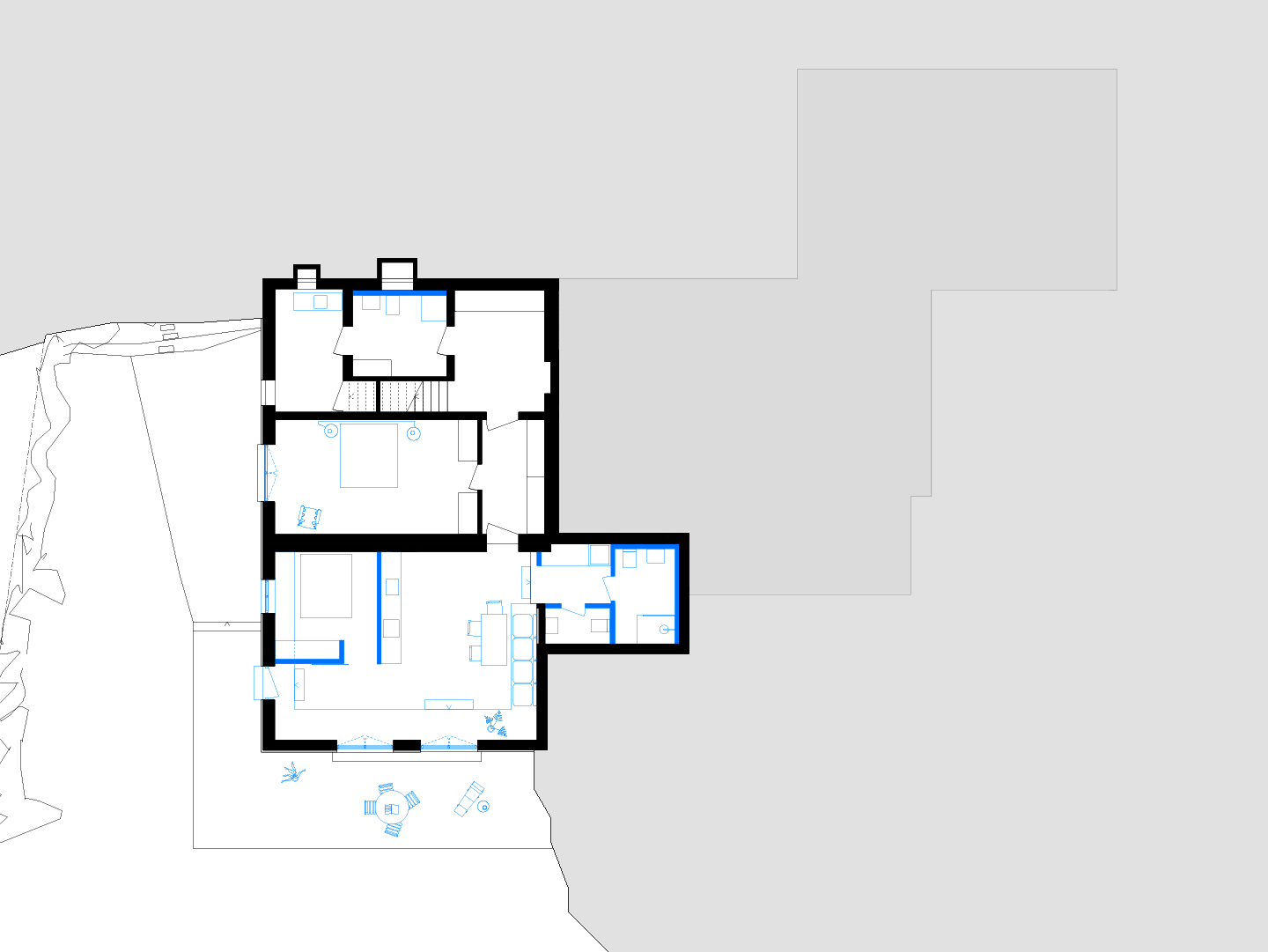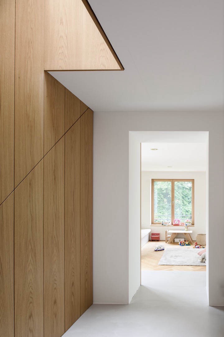 Der neuere Gebäudeteil ist dreigeschossig und stammt aus den 80er Jahren. Hier wurde das Schwimmbad stillgelegt und in eine Gästewohnung umgebaut, daraufhin die Raumproportionen im ganzen Haus überarbeitet – im Wohnzimmer wurde die Geschossdecke abgesenkt, im Obergeschoss teilweise der Dachraum geöffnet.