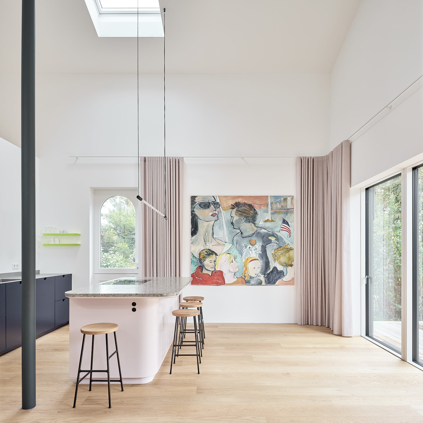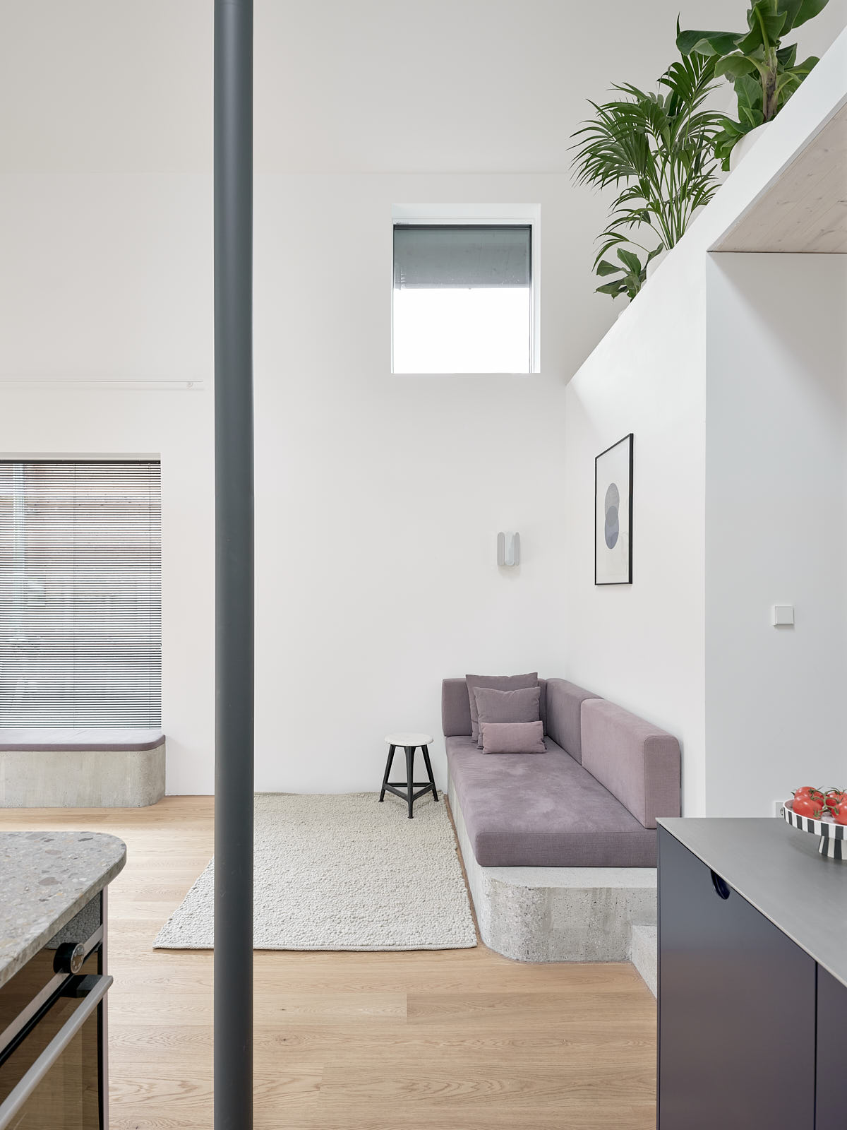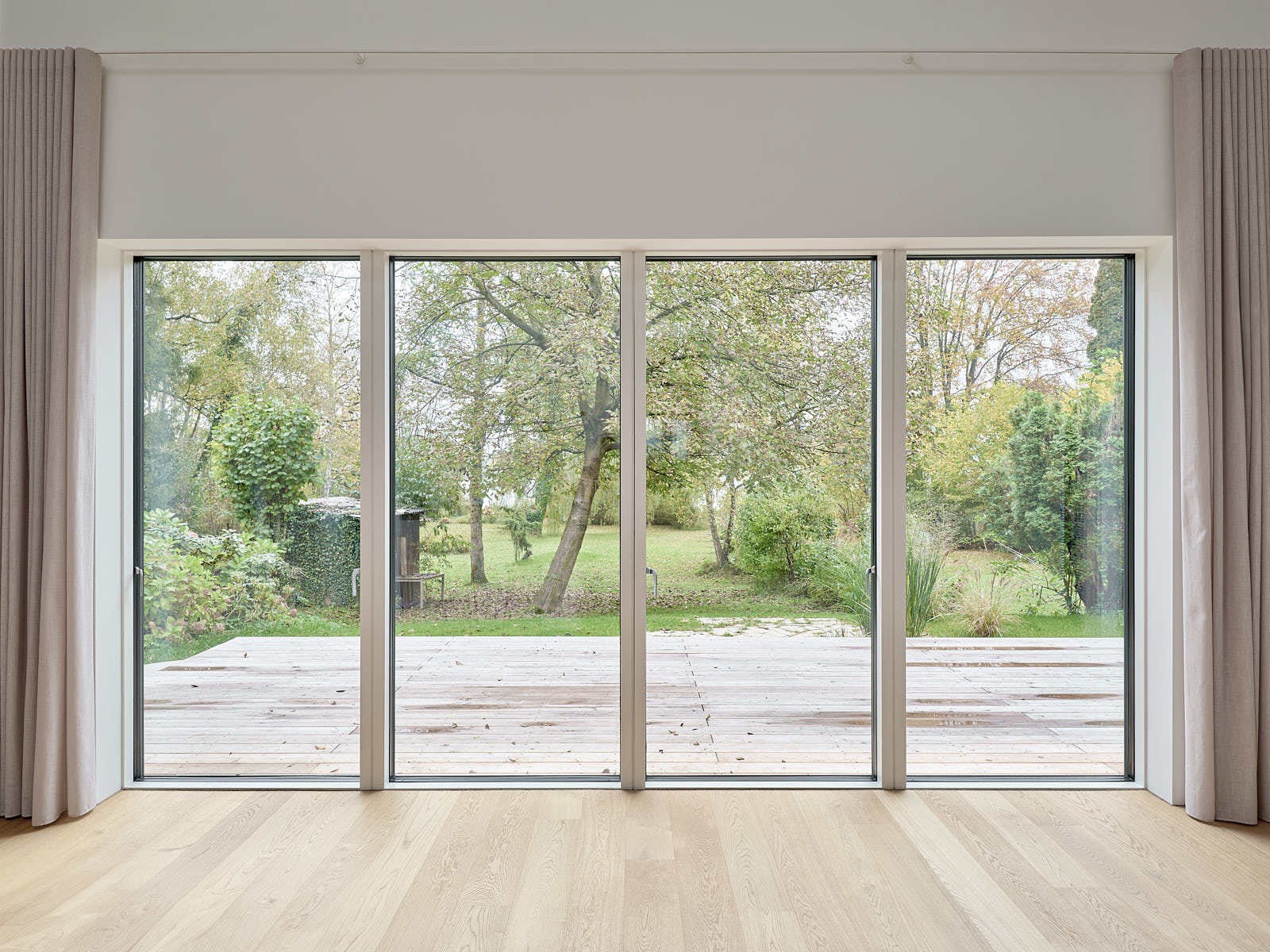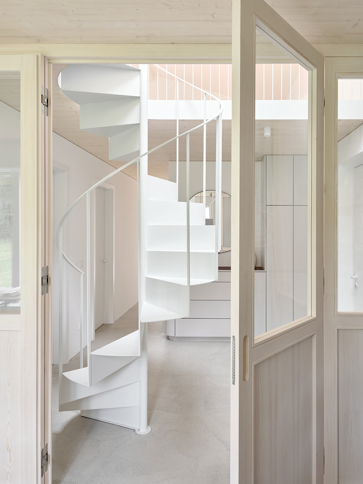 Der Wohnbereich ist zweigeschossig und erhält viel Tageslicht aus 4 Richtungen, mit Ausblicken auf Grundstück und See.